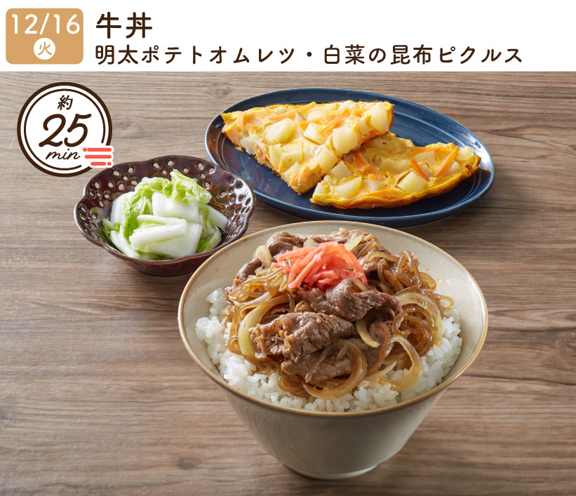 2025/12/16(火) 1week『牛丼・明太ポテトオムレツ・白菜の昆布ピクルス』