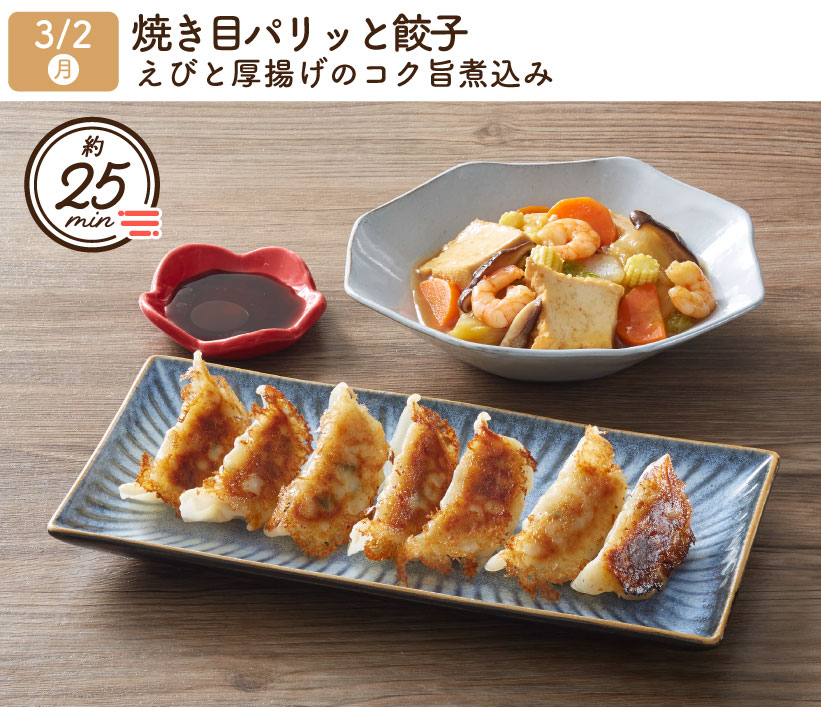2026/3/2(月) 1week『焼き目パリッと餃子・えびと厚揚げのコク旨煮込み』