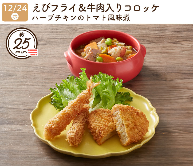 2025/12/24(水) 1week『えびフライ&牛肉入りコロッケ・ハーブチキンのトマト風味煮』