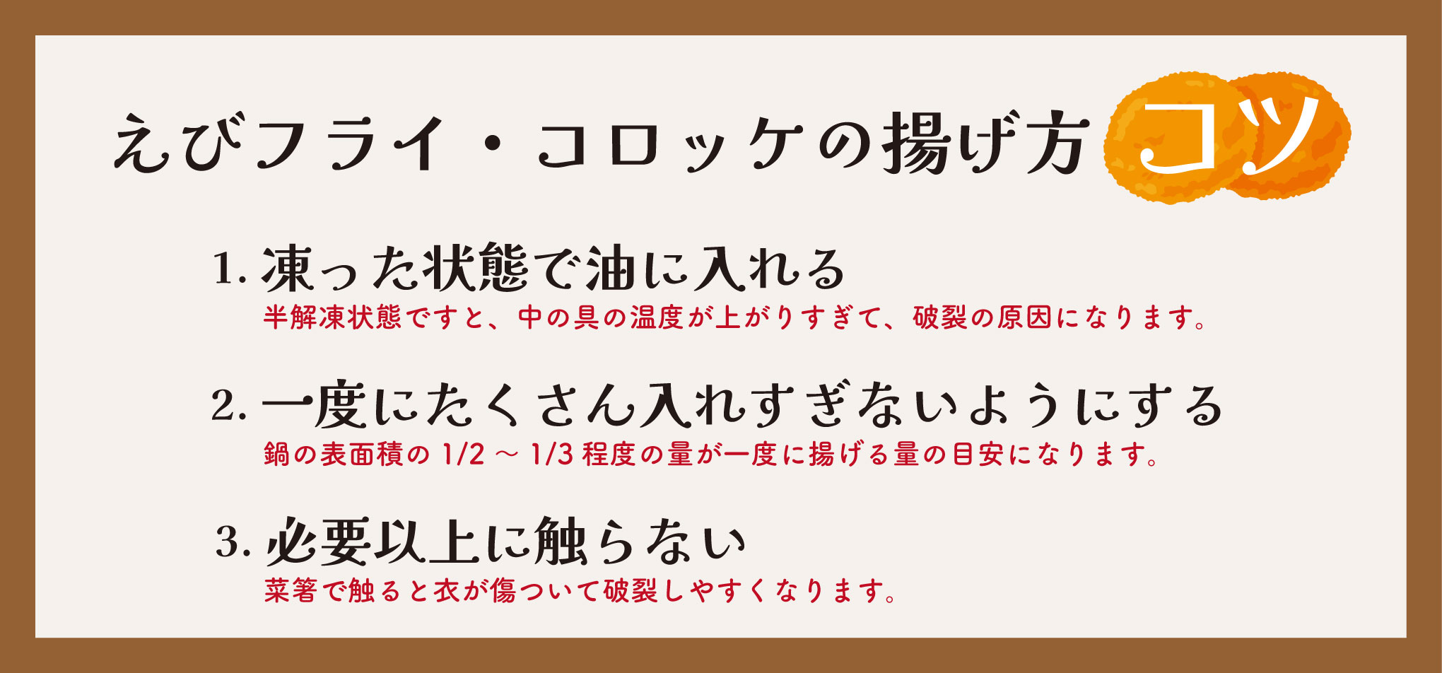 ①フライ、コロッケは凍ったまま、中温(170~180℃)の揚げ油で揚げる。