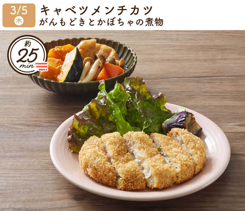 2026/3/5(木) 1week『キャベツメンチカツ・がんもどきとかぼちゃの煮物』