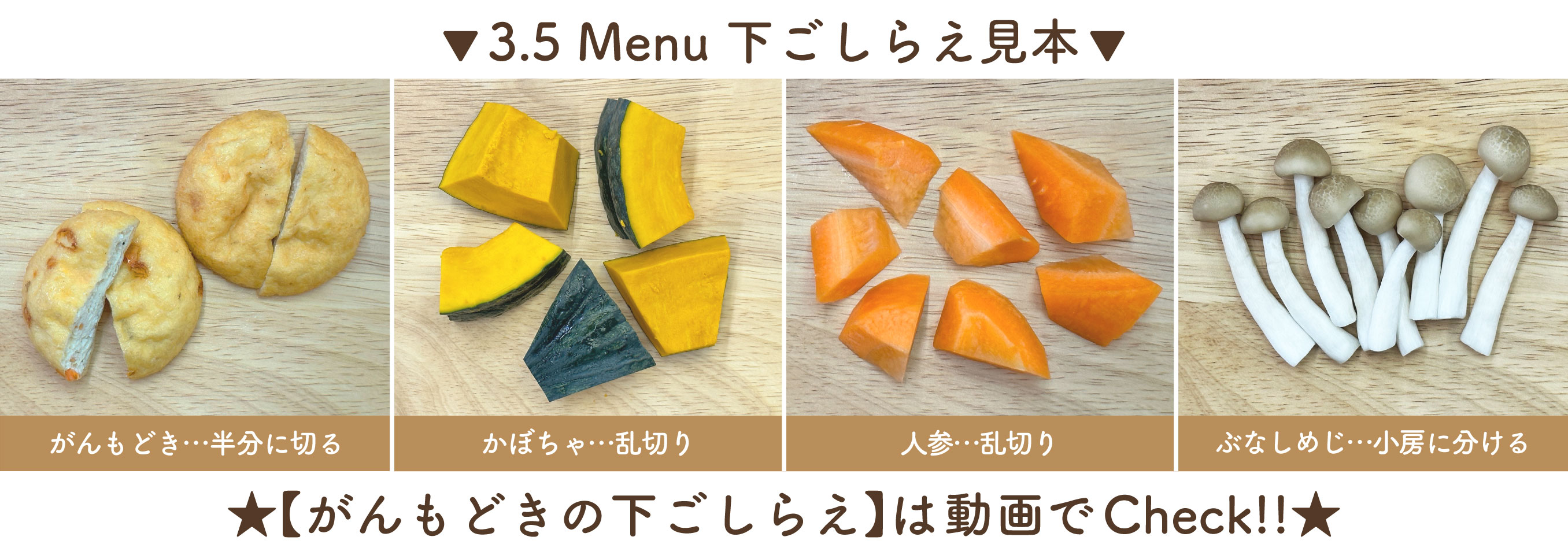 ㋐がんもどき・・・熱湯をかけて油抜き→半分に切る
