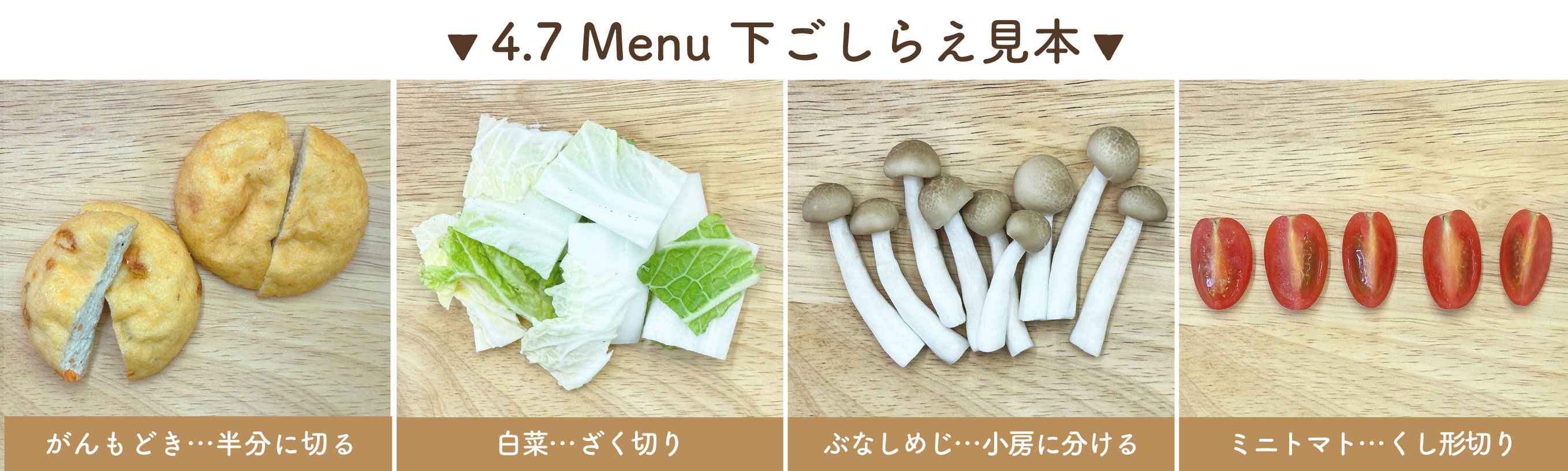 ㋐がんもどき・・・熱湯をかけて油抜き→半分に切る