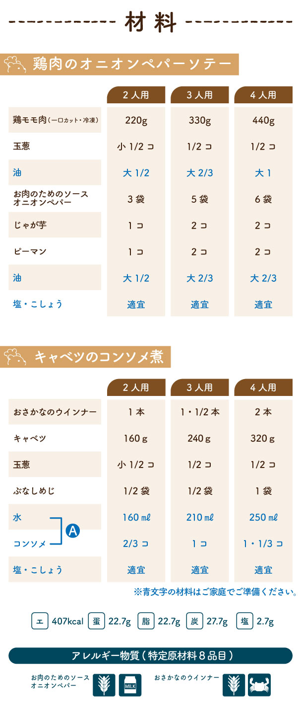 玉葱・じゃが芋・ピーマン・キャベツ・ぶなしめじ・・・国産 鶏モモ肉・・・ブラジル産又はタイ産