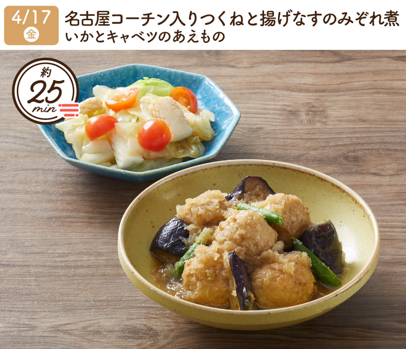 2026/4/17(金) 1week『名古屋コーチン入りつくねと揚げなすのみぞれ煮・いかとキャベツのあえもの』