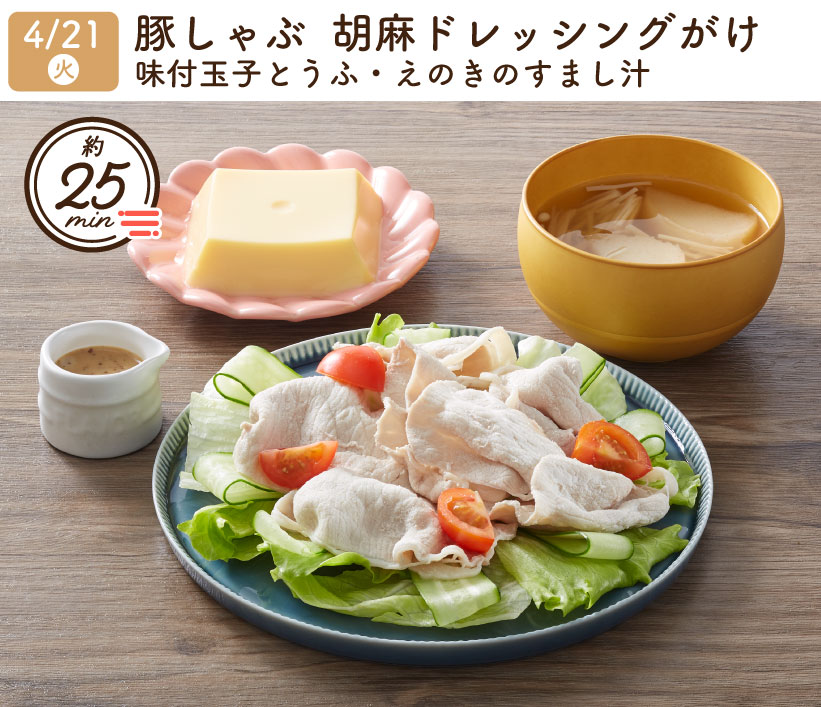 2026/4/21(火) 1week『豚しゃぶ 胡麻ドレッシングがけ・味付玉子とうふ・えのきのすまし汁』