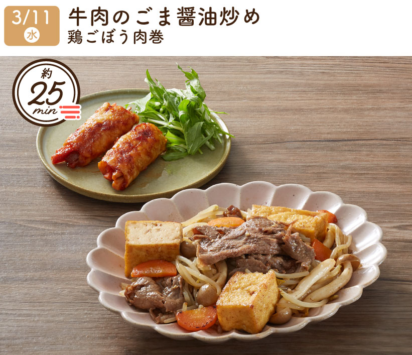2026/3/11(水) 1week『牛肉のごま醤油炒め・鶏ごぼう肉巻』
