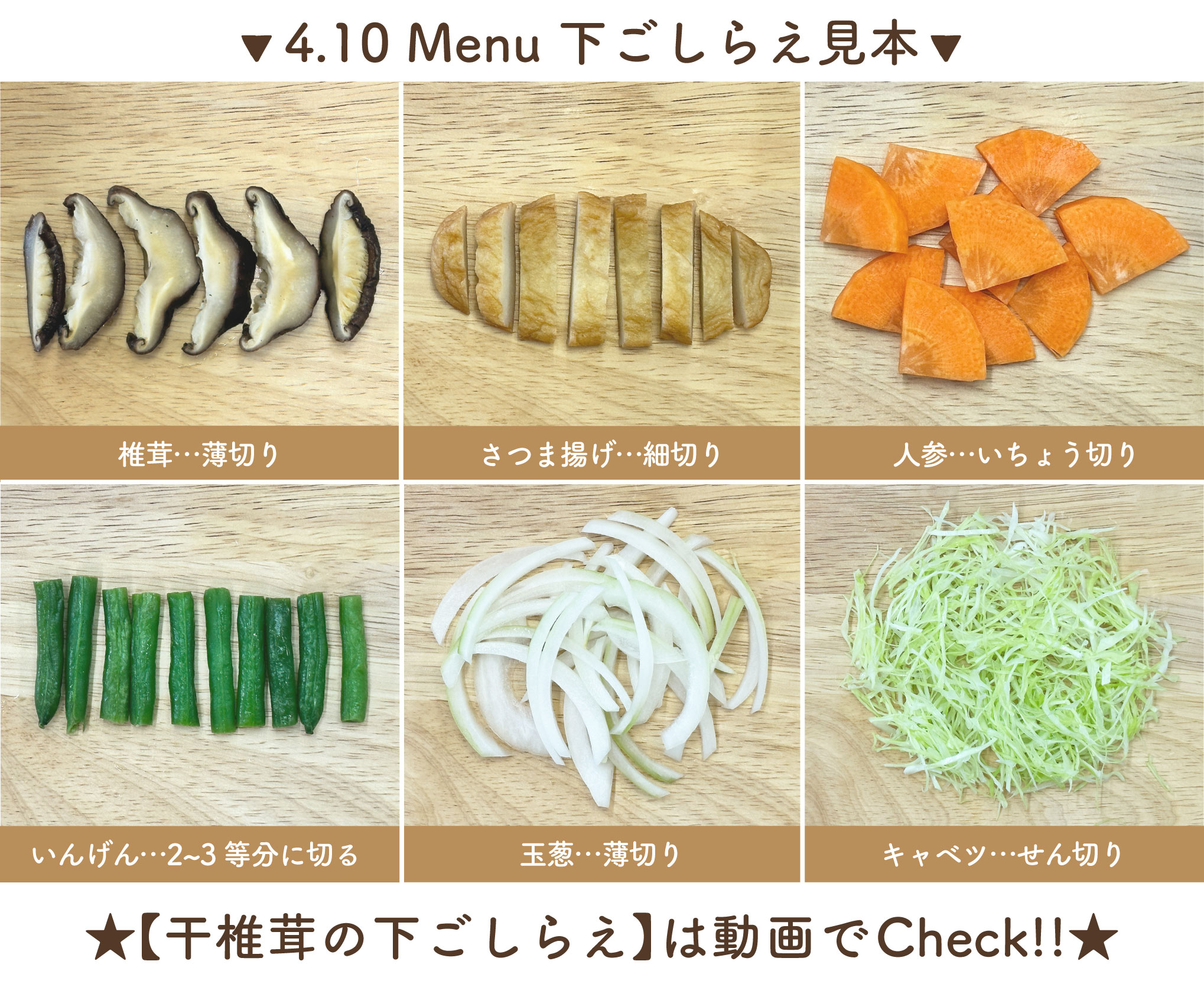 ㋐椎茸・・・ぬるま湯戻し(戻し汁はとっておく)→薄切り