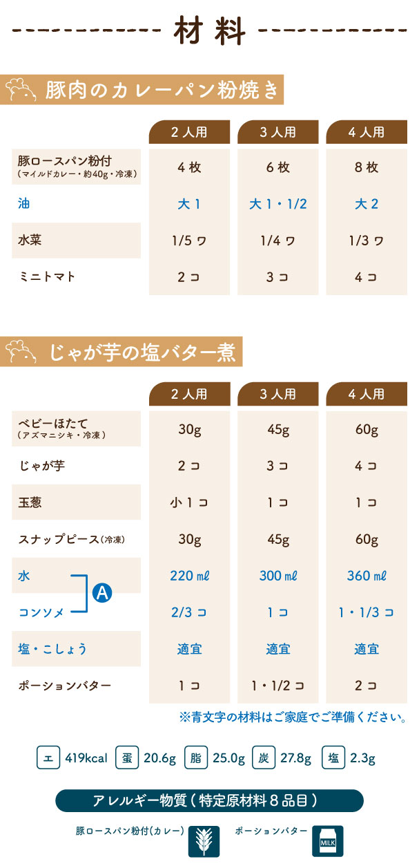 水菜・ミニトマト・じゃが芋・玉葱・・・国産 豚ロースパン粉付・・・アメリカ産 ベビーほたて・・・中国産