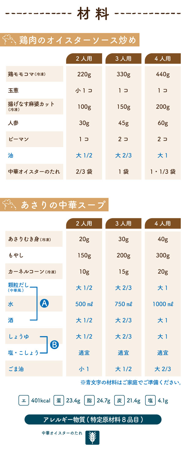 中華オイスターのたれ(常温)・・・醤油(国内製造)、砂糖、オイスターエキス、米発酵調味料、おろし生姜、食塩、魚醤、おろしにんにく、植物油、醸造酢、チキンエキス、豆板醤、香辛料/増粘剤(加工デンプン、キサンタン)、調味料(アミノ酸等)、カラメル色素、(一部に小麦・ごま・大豆・鶏肉・豚肉を含む)