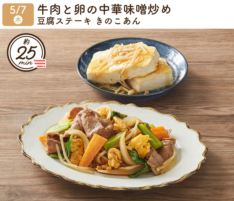 2026/5/7(木) 1week『牛肉と卵の中華味噌炒め・豆腐ステーキ きのこあん』