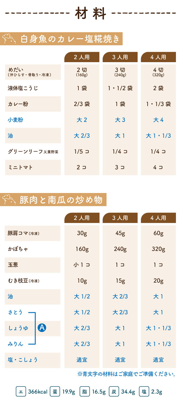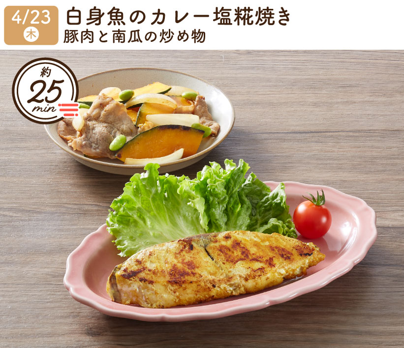 2026/4/23(木) 1week『白身魚のカレー塩糀焼き・豚肉と南瓜の炒め物』
