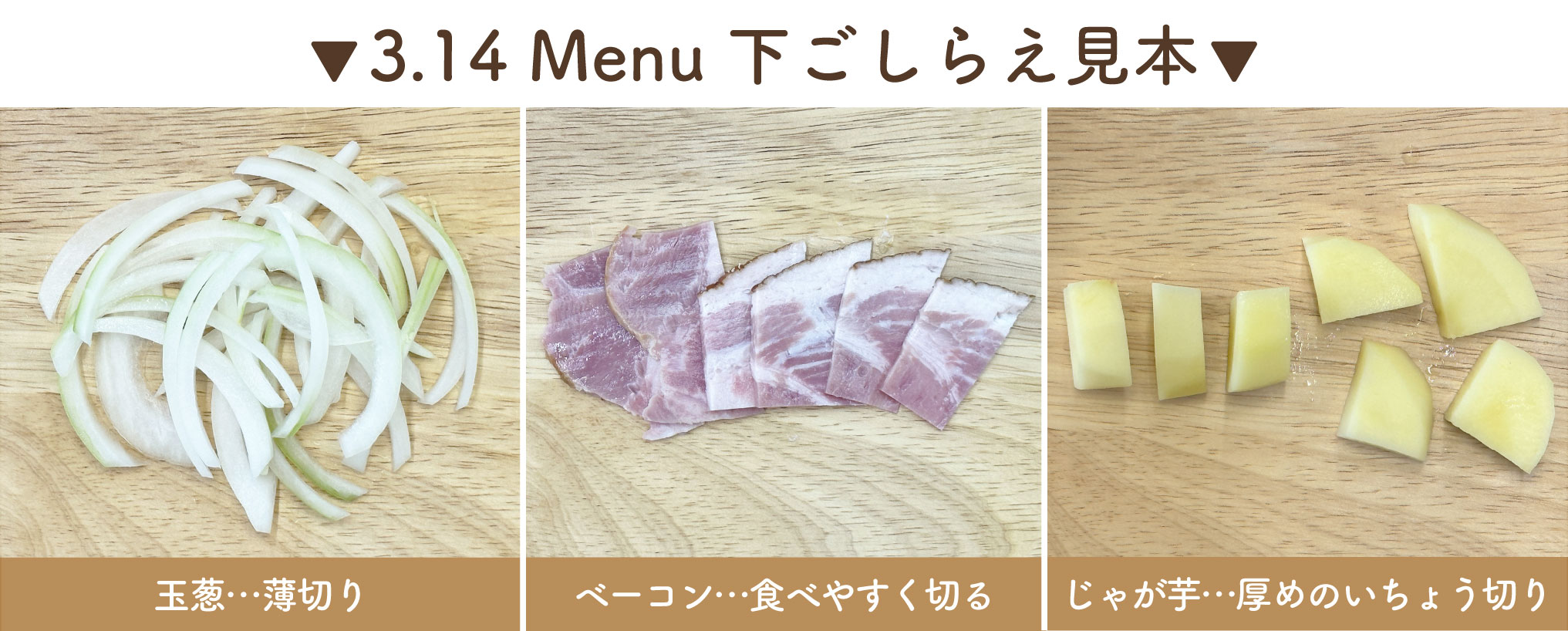 じゃが芋・・・厚めのいちょう切り→水さらし→ゆでる(途中、コーンも加える)