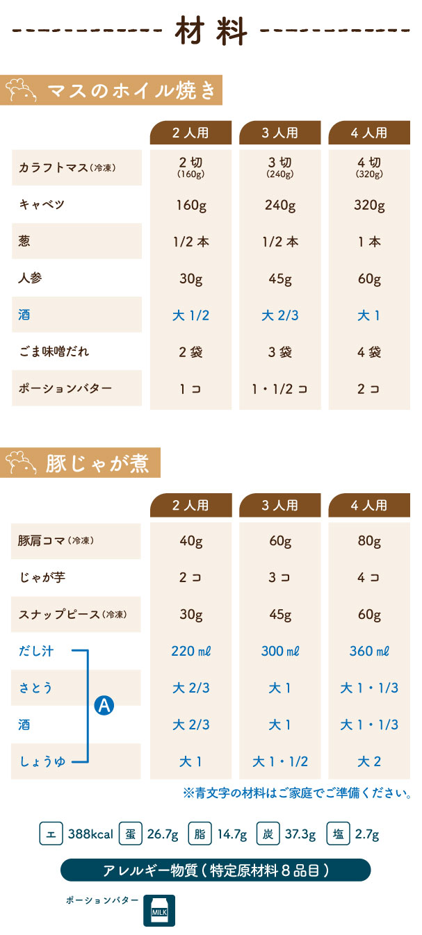 キャベツ・葱・人参・じゃが芋・・・国産 豚肩コマ・・・カナダ産 カラフトマス・・・ロシア産