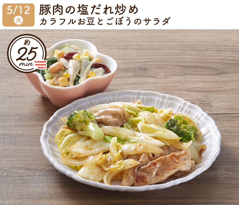 2026/5/12(火) 1week『豚肉の塩だれ炒め・カラフルお豆とごぼうのサラダ』