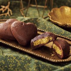 ローストしたハート型のチョコレートの中に、風味豊かなピスタチオペーストと、ザクザク食感のカダイフ風麺を入れてしっとりと焼き上げました♡