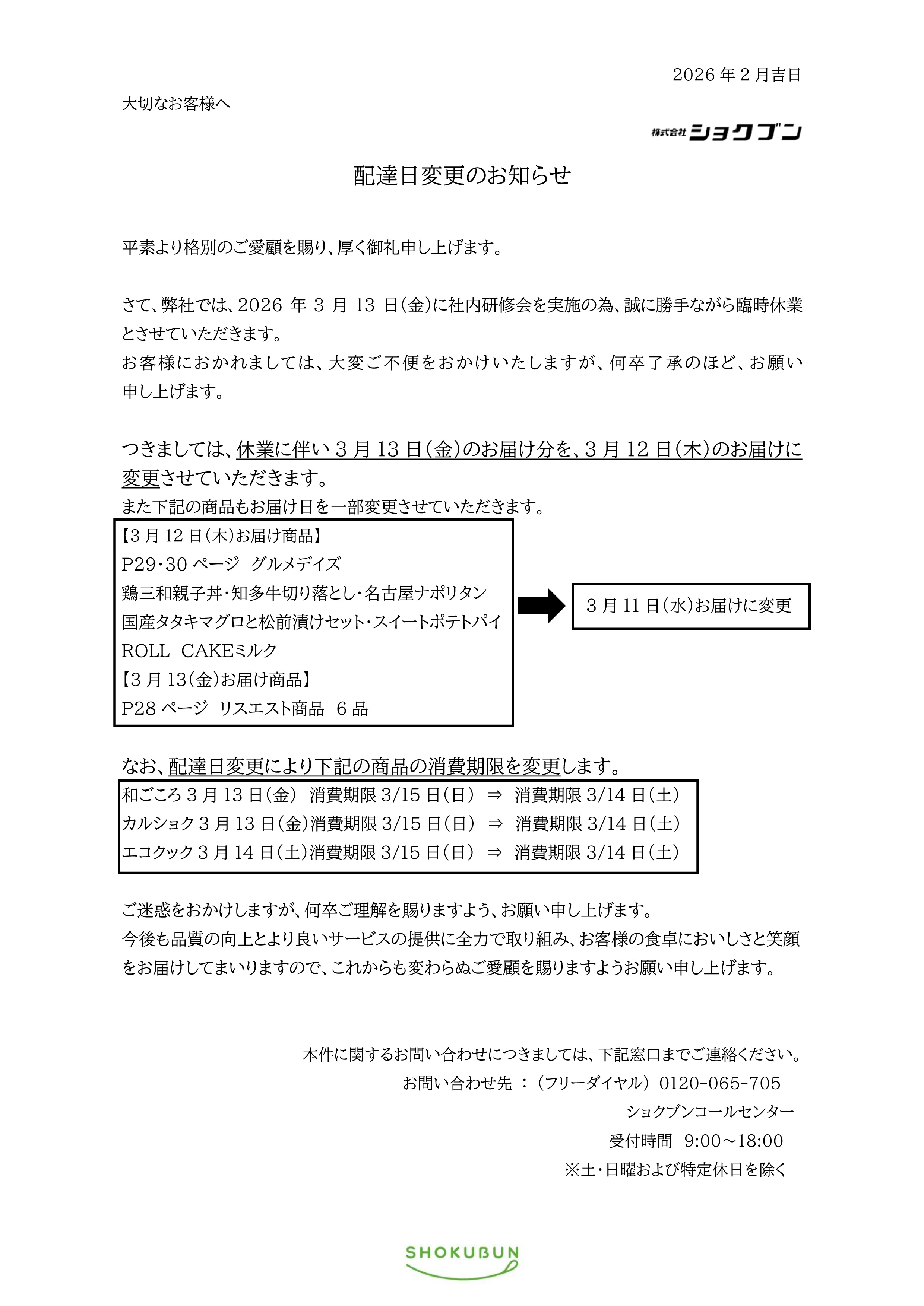3月9日週 配達日変更 および 3月13日(金)臨時休業のお知らせ